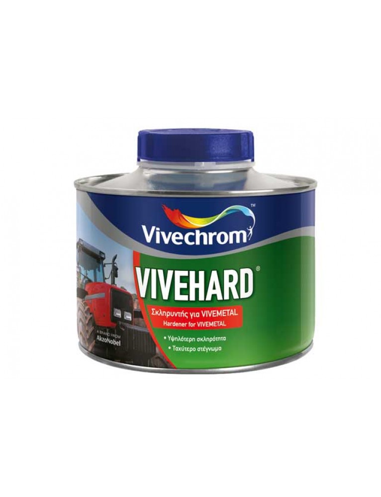Το VIVEHARD είναι σκληρυντής για αλκυδικά χρώματα για χρήση από επαγγελματίες. Η προσθήκη του VIVEHARD στo VIVEMETAL επιταχύνει το στέγνωμα, αναπτύσσει πολύ μεγάλης σκληρότητας στεγνό φιλμ σε μικρότερο χρόνο, ενισχύει τις αντοχές στα χτυπήματα, θωρακίζει την γυαλάδα και την απόχρωση ακόμα και στις πιο δυσμενείς καιρικές συνθήκες. Διάρκεια ζωής μίγματος αναμεμιγμένο με vivehard 4 ώρες