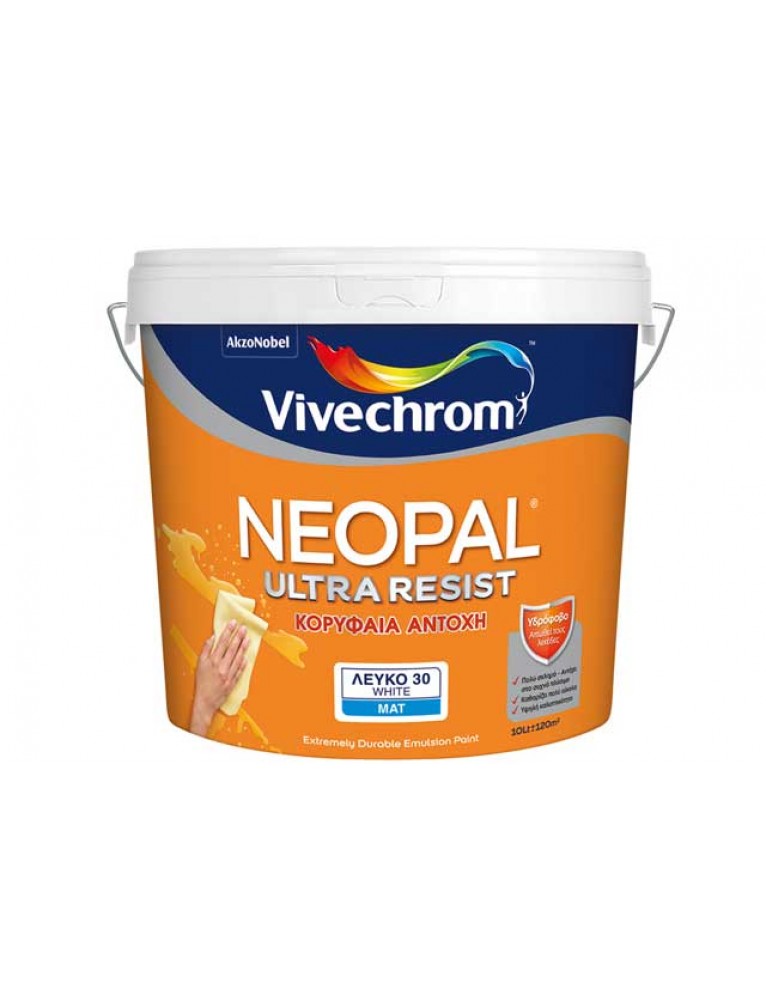 To NEOPAL Ultra Resist είναι πλαστικό χρώμα κορυφαίας αντοχής, για εσωτερική χρήση. Αυτό το πολύ σκληρό και εξαιρετικά πλενόμενο χρώμα (Class 1, EN 13300), δημιουργεί μία υδρόφοβη μεμβράνη που μετατρέπει τους κοινούς υδατοδιαλυτούς λεκέδες όπως αναψυκτικά, καφές, κρασί, λάσπη κλπ σε σταγόνες οι οποίες ρέουν στην επιφάνεια του χρώματος χωρίς να διεισδύουν σε βάθος. Έτσι μπορεί να καθαριστεί πολύ πιο εύκολα απ’ ότι ένα κοινό πλαστικό χρώμα και οι τοίχοι παραμένουν σαν καινούργιοι για καιρό. Έχει πολύ υψηλή καλυπτικότητα και απόδοση, θαυμάσιο άπλωμα και στεγνώνει γρήγορα. Προσφέρει ένα καλαίσθητο Ματ φινίρισμα. Διατίθεται σε λευκό και απεριόριστες αποχρώσεις.